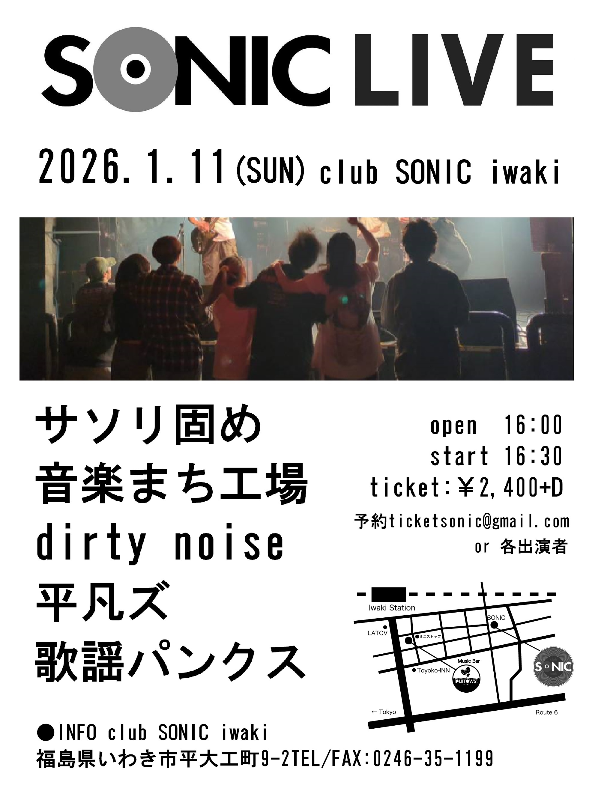 ●INFO club SONIC iwaki 〒970-8026 福島県いわき市平大工町9-2 MAIL:sonic-iwaki@sonic-project.com TEL/FAX:0246-35-1199 |