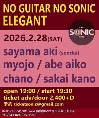 ![]() 2026/2/28(土) NO GUITAR NO SONIC ELEGANT open 19:00 / start 19:30 ticket adv/door 2,400+D 予約 ticketsonic@gmail.com -cast- 佐山亜紀(仙台)/ 明星 / あべあいこ Chano / さかいかの ![]() |