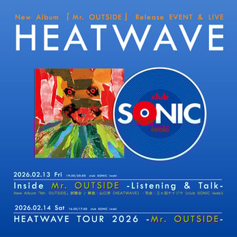 2026/2/13(金) Inside Mr. OUTSIDE –Listening & Talk– HEATWAVE ニューアルバム『Mr. OUTSIDE』試聴会 opne 19:30 / start 20:00 料金:1ドリンク込み 2,500円(税込) ディスカウント:LIVEチケット購入者500円引き チケット予約:ticketsonic@gmail.com