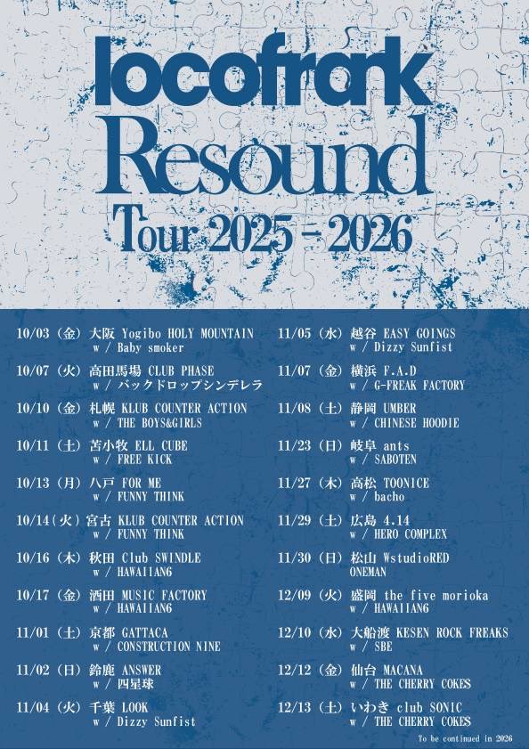 locofrank presents Resound Tour 2025 - 2026 open 18:00 / start 18:30 Ticket adv¥4,300+D e+https://eplus.jp/sf/detail/K000000489 -cast- locofrank / THE CHERRY COKES ![]() |
